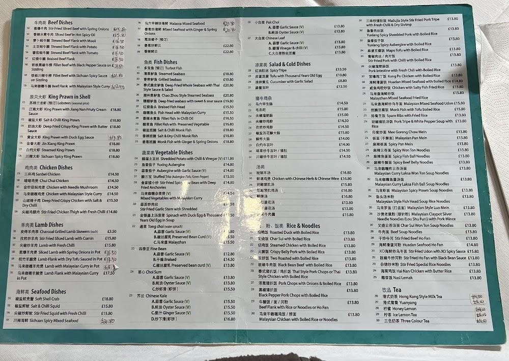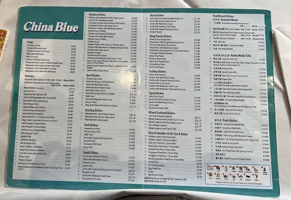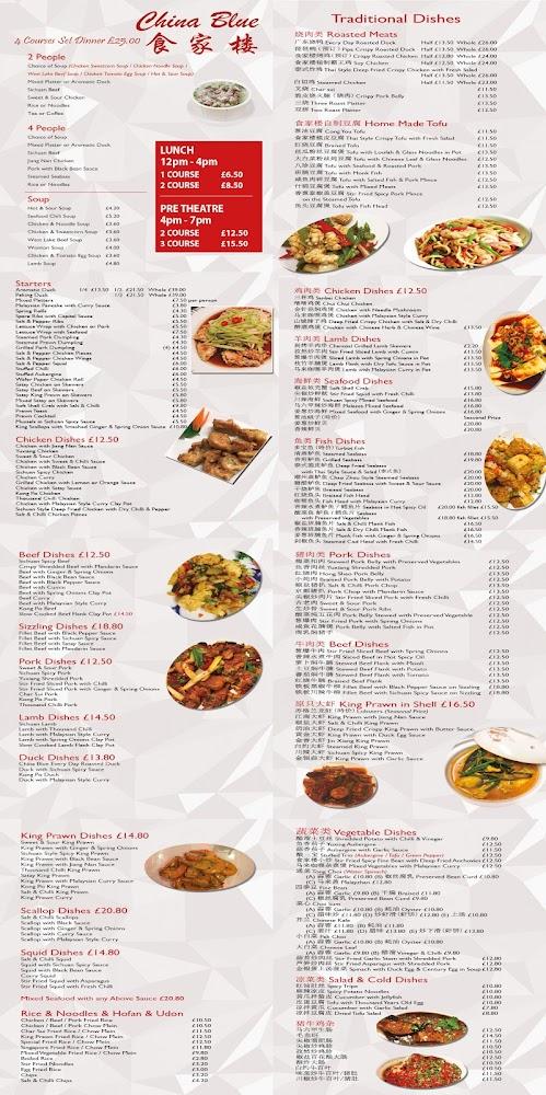 The menu at China Blue is a celebration of Chinese and Malaysian culinary traditions, showcasing a range of flavorful dishes that cater to various tastes. Starting with an impressive selection of starters, diners can indulge in dishes like salt and pepper chicken wings and prawn cocktails, providing a fantastic introduction to the meal. Chicken dishes dominate the menu with options like grilled chicken with lemon sauce and chicken with ginger and spring onion, offering something for every palate. King prawn and beef dishes, including kong po beef and king prawn with black bean sauce, reflect a beautiful fusion of spices and textures. Those craving something unique can explore homemade tofu options or traditional Malaysian attire with dishes like Malaysian curry chicken. The extensive rice and noodle offerings, including roasted duck chow mein and stir-fried ho fun, promise a filling meal complemented by small plates and sides. Additionally, China Blue boasts a selection of desserts that diners adore, capping off meals with sweet delights.